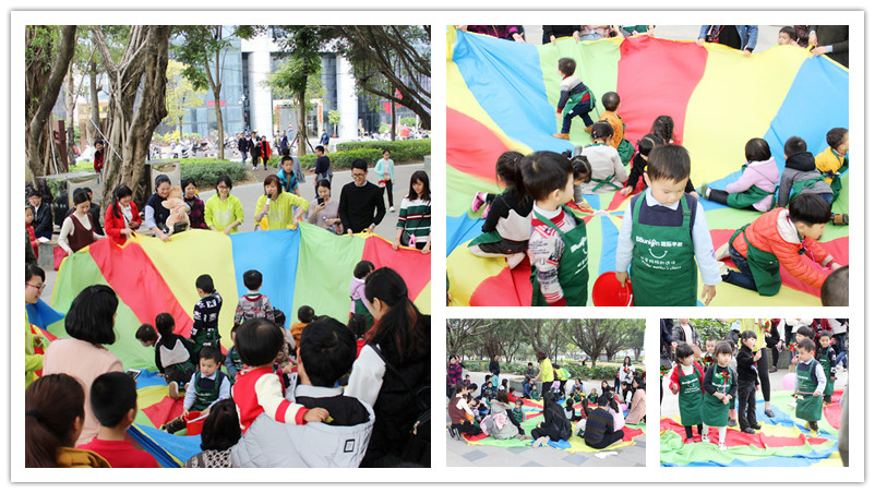 彩虹伞下的欢乐时光。大大的彩虹伞,小小的宝贝,音乐的律动,宝贝们的跳跃。