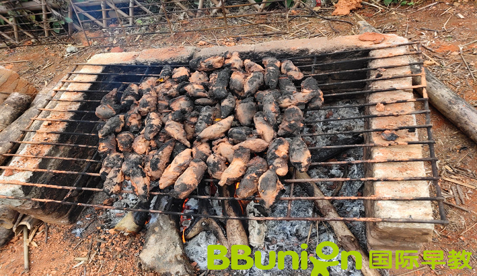 地瓜穿好泥巴衣,拜托教官叔叔帮忙放在火堆上“噼里啪啦”,让时间来沉淀它。