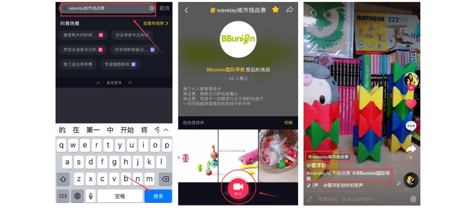 3.将视频发至抖音,并带话题#Wavelay城市挑战赛#,@BBunion国际早教 发布即可;